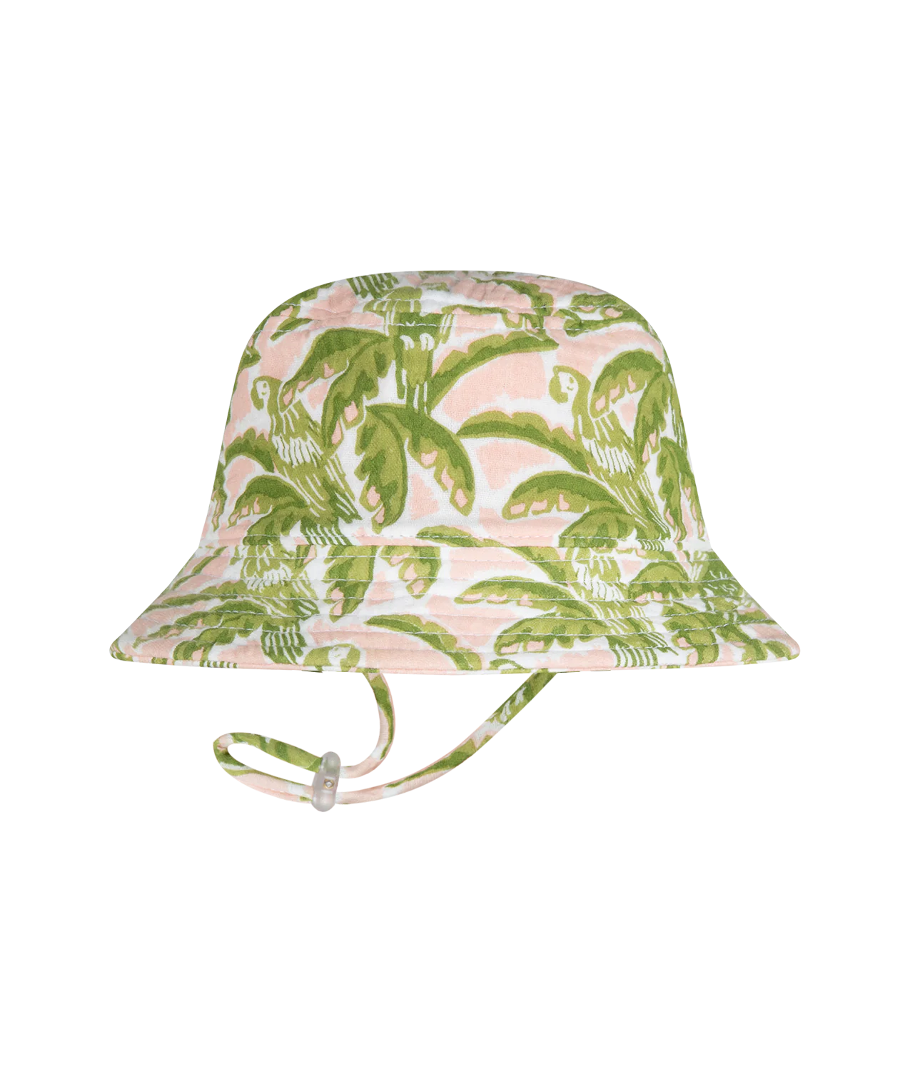 The Kiama is a beautifully soft and sweet choice, crafted from 100% cotton double gauze for a gentle feel against baby's skin. It features an exclusive tropical print and a classic woven flag logo, perfect for warm-weather adventures. This breathable hat stays safe and secure with a detachable, adjustable chin strap, a cotton lining, and a convenient quick-release clasp.