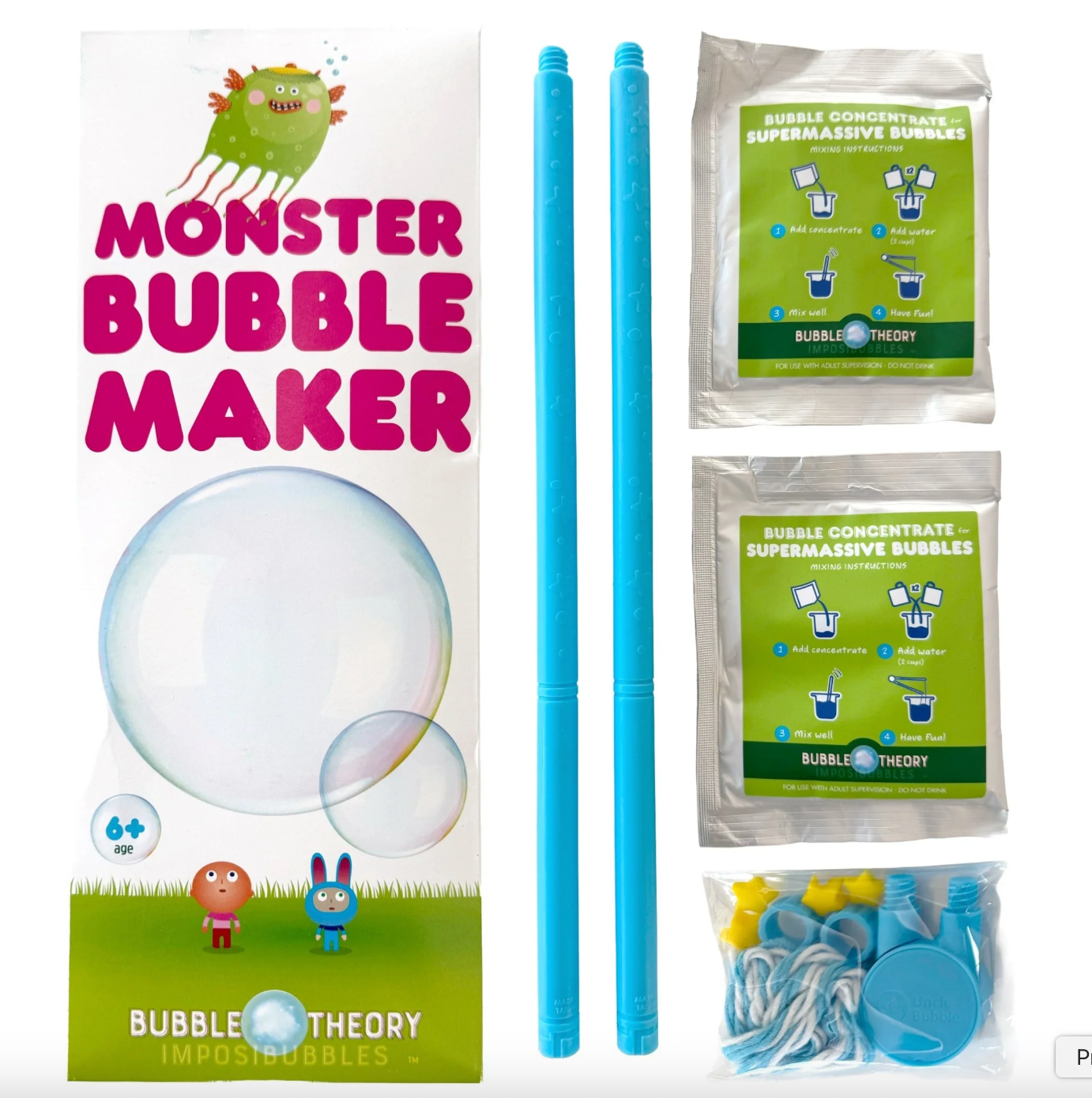 Our kit contains two packets of super-massive bubble concentrate and an adjustable bubble maker wand with three bubblator modes