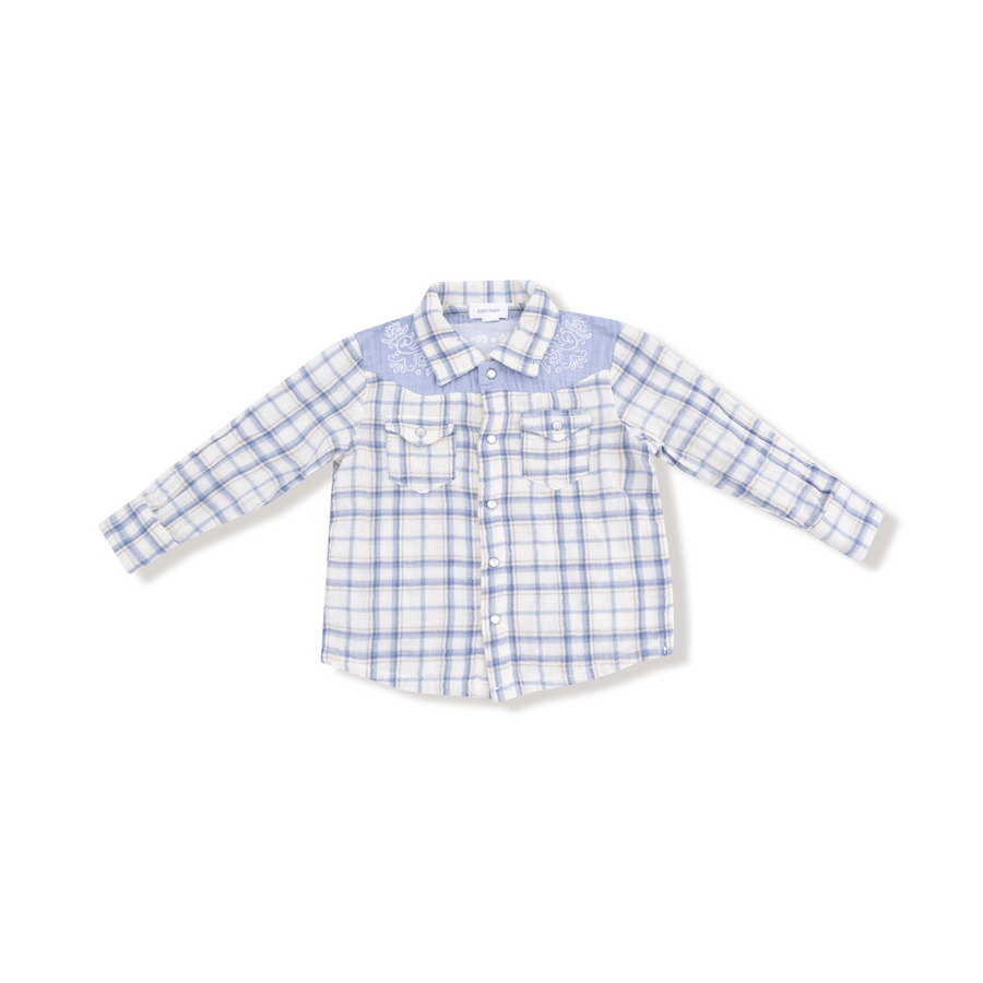 Blue Plaid - Western Pear Snap Shirt with Howdy Embroidery
