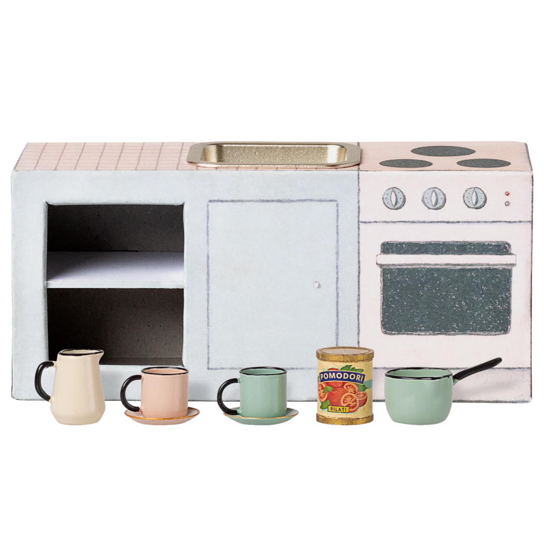 The small kitchen counter comes with 2 cups and 2 plates, a pot and a pitcher and a small can. The small sink is made of metal to look as real as possible. It fits perfectly into the kitchen in the SuitCasa mouse house.