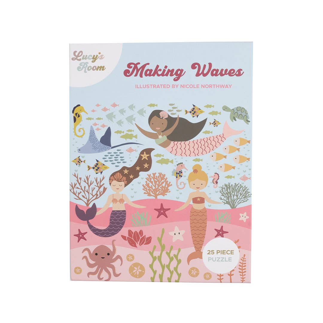 Little Ones will love our Making Waves puzzle from Lucy's Room, featuring characters from the Making Waves Emerson and Friends mermaids print. This puzzle is a fun and engaging way to visit your mermaid friends every day. Material: Cardboard Size: 24 in. x 24 in. Piece Count: 25 Age Group: 3-5 yrs.