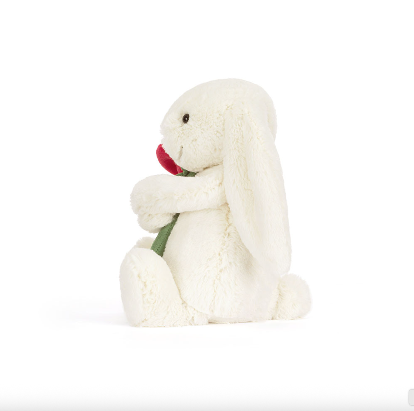Calm, un-rushable Cream Bunny with Rose takes the time to notice the beauty all around her.