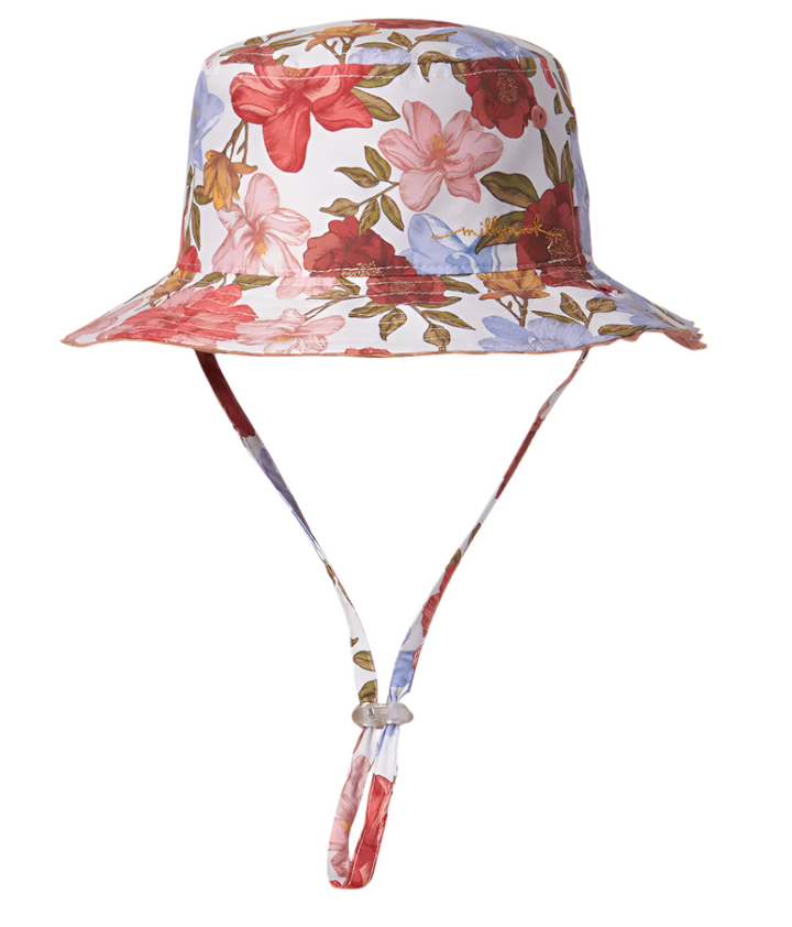 Beautiful floral pattern girls bucket. Reversible with mauve on the inside. 50+ UPF sun protection, made from quick dry fabric so can be used as a swim hat. Detachable chin strap.