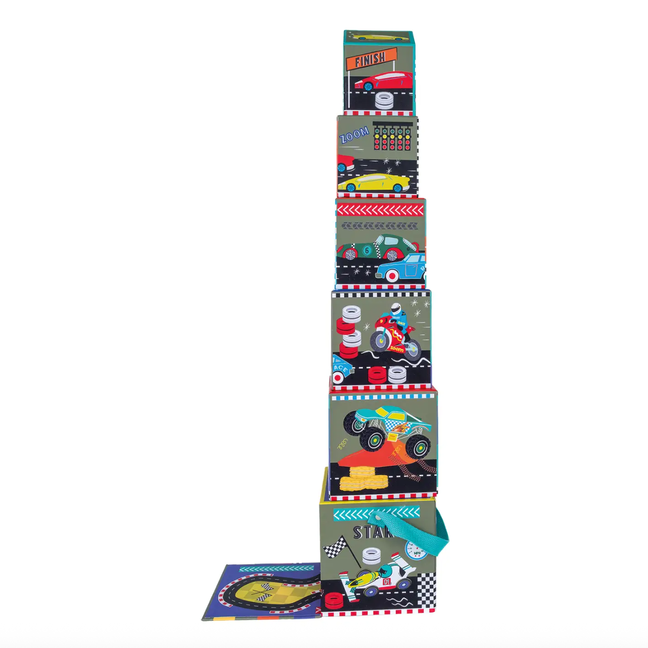 Get ready for endless amounts of fun with Stack & Play. Make a tower, then hide and play using the wooden pieces. Count the numbers on one side, then match up the scenes on the other (either by stacking or laying them side by side). This WHEEL-y cool Cars design features monster trucks, motorbikes and racing cars. Stack & Play includes 6 stacking cubes, 3 wooden play pieces, 2 on wheels. All parts are stored in the biggest box with a handy carry handle, making it so easy to take around with you!