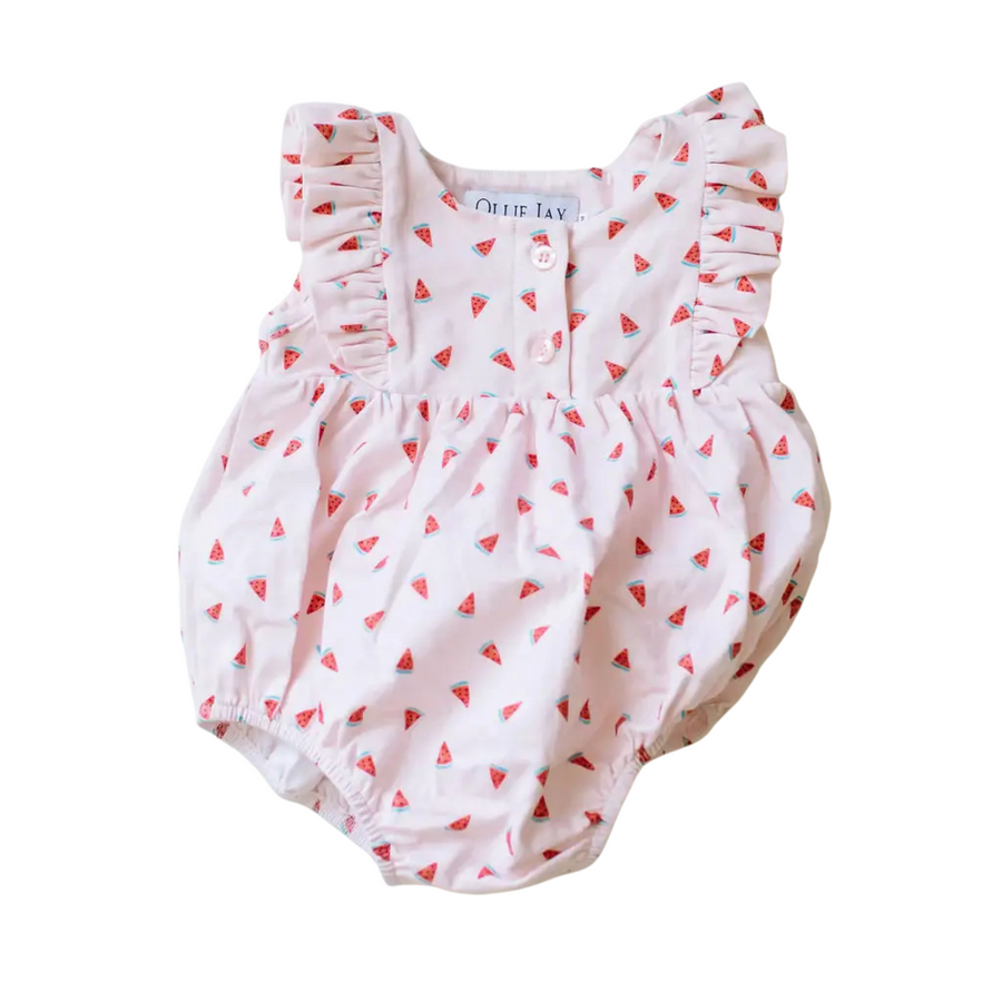 Betsy Bubble is ultra-soft and stretchy fabric, this romper features ruffled sleeves, three-button detail on the front, and a three-snap closure for quick and easy diaper changes.