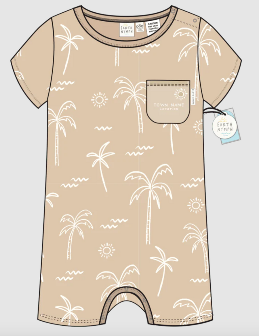 This summer essential playsuit is part of our Baby Organic Collection, featuring the Palm Scenic Yardage Print, designed in house and exclusive to Earth Nymph. Front chest has a pocket with printed customised name drop. The fit is our classic, comfy short sleeve playsuit, made from soft 100% organic cotton.