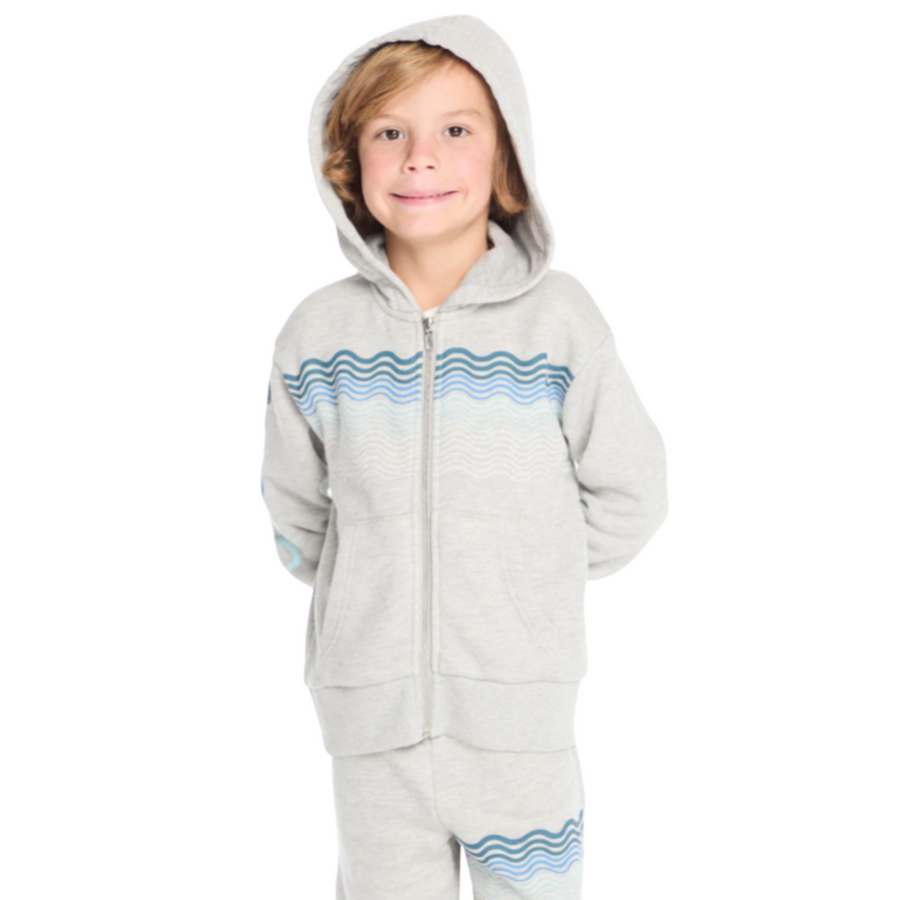 Made with soft Heather Grey fabric and featuring a unique abstract wave motif, this hoodie is perfect for your little surfer.