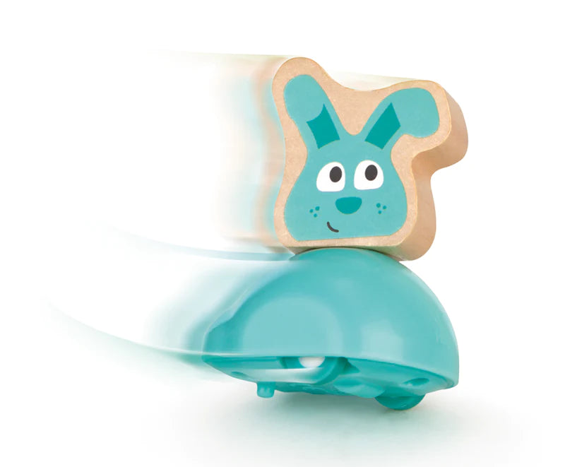 This cute bunny has a friction motor. Run it along the floor a few times to charge it up then put it down and watch it speed off.